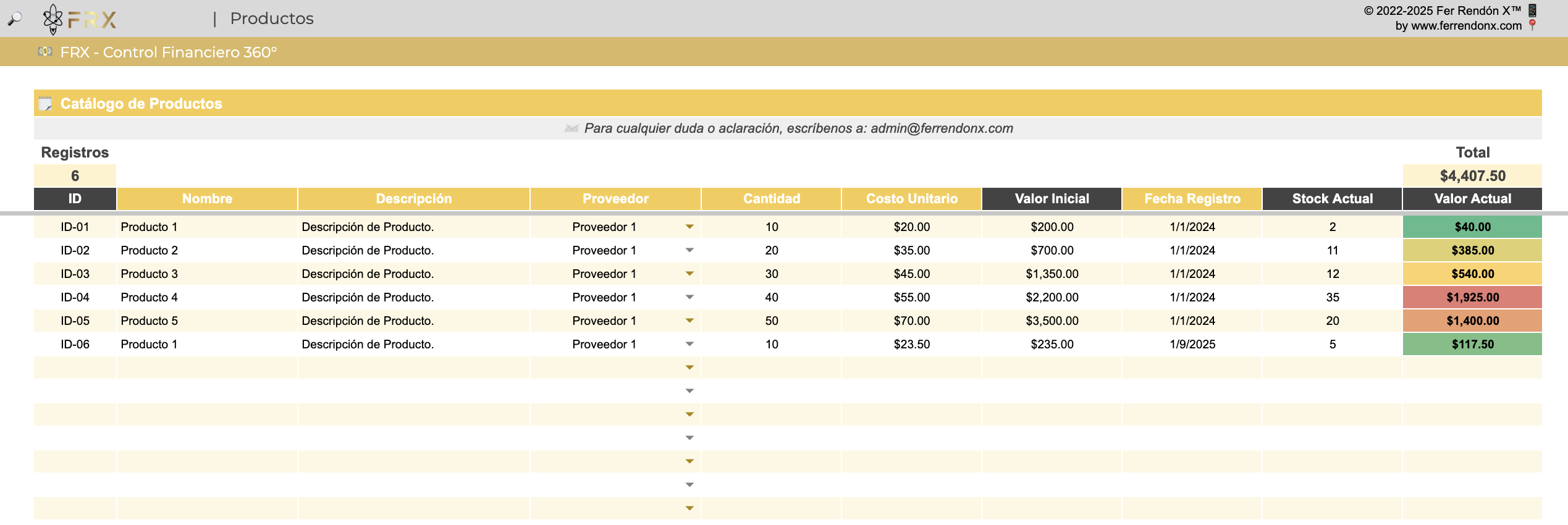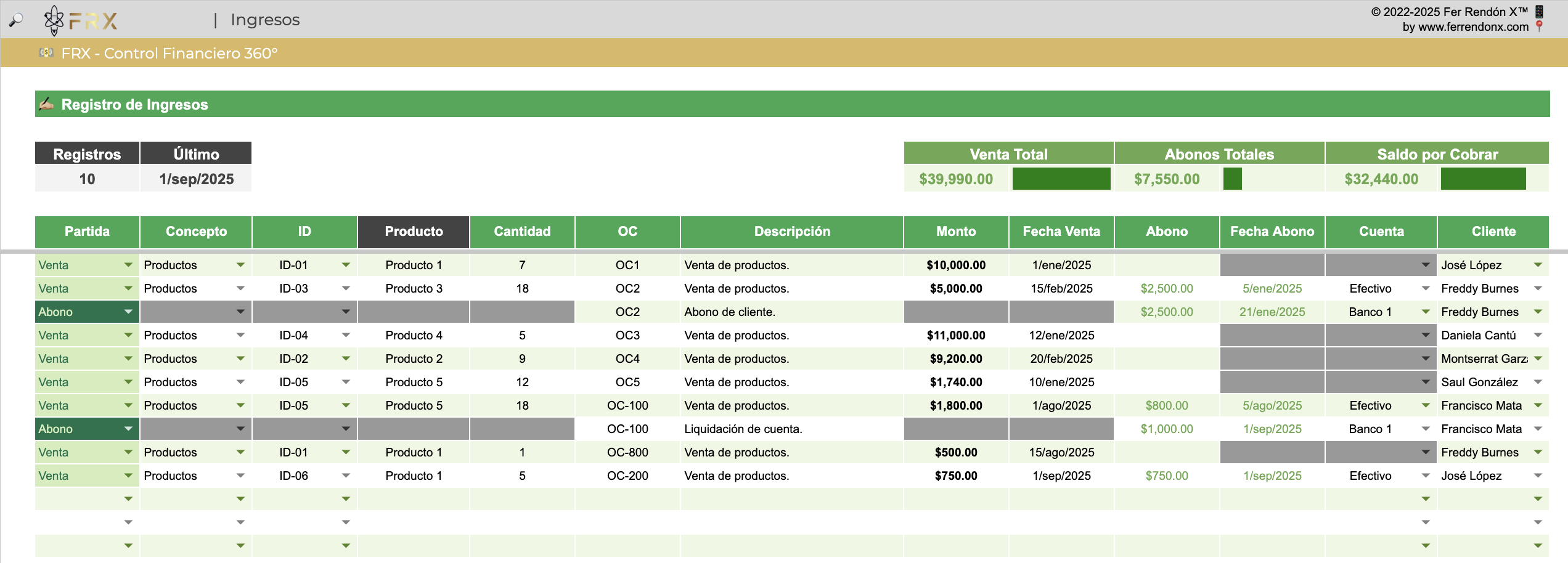 La herramienta de Control Financiero 360° para Comercializadoras en Google Sheets te permite llevar un control completo de las finanzas de tu negocio, brindándote visibilidad y claridad sobre todo lo que sucede en tu operación. Tener información organizada y actualizada es clave para tomar decisiones estratégicas.