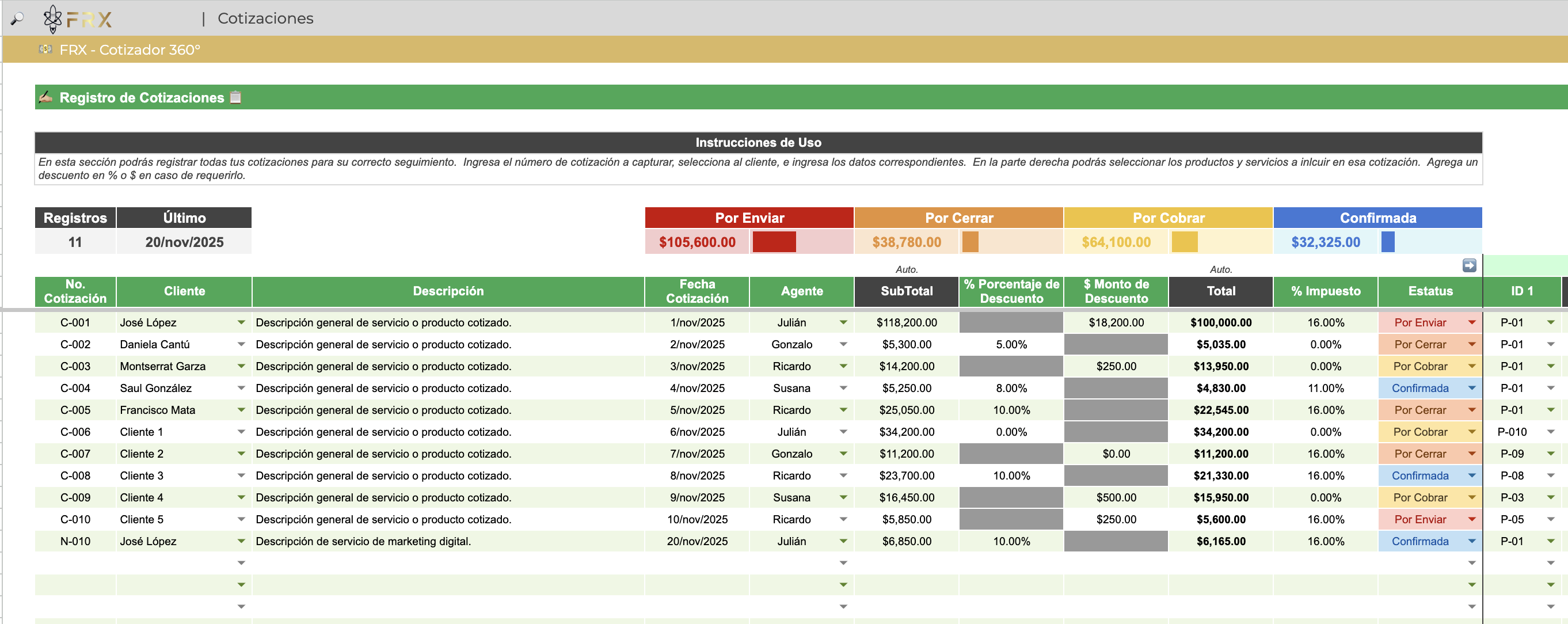 El Cotizador de Negocio 360° en Google Sheets te ayudará a enviar a tus clientes de manera clara y formal las cotizaciones de tus productos y servicios. Nuestra herramienta destaca por su simplicidad y practicidad, y este cotizador no es la excepción.