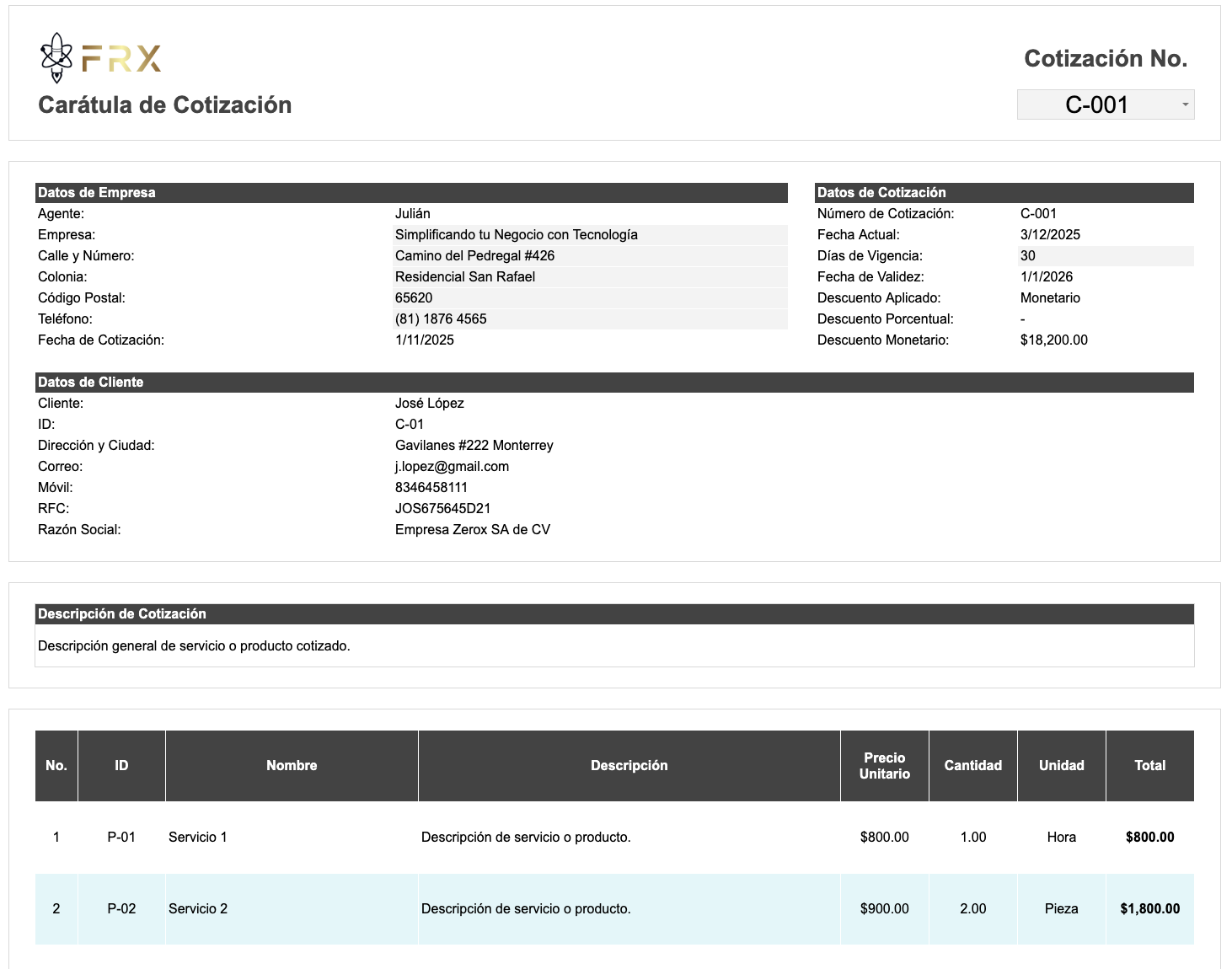 Podrás contar con tus catálogos de clientes y productos o servicios para generar cotizaciones personalizadas y con una presentación profesional. Si buscas una solución fácil de usar, rápida y que eleve la imagen de tu negocio al enviar cotizaciones, esta herramienta es ideal para ti.