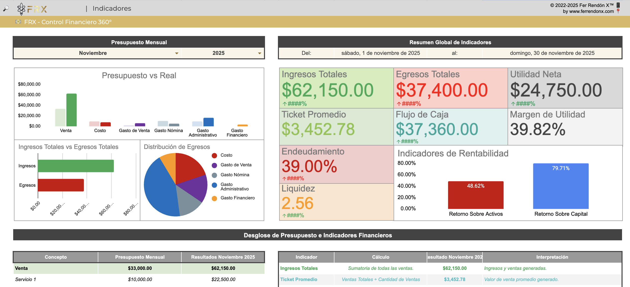 La herramienta de Control Financiero 360° en Google Sheets te permite llevar un control completo de las finanzas de tu negocio, brindándote visibilidad y claridad sobre todo lo que sucede en tu operación.